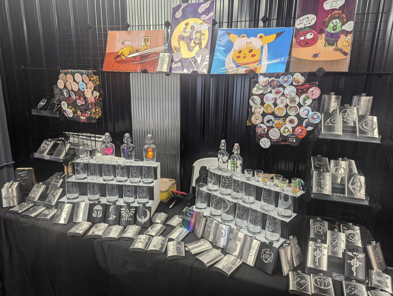 I sell Nerdy hand etched glassware, sandblasted flasks, pins, buttons, posters, and coasters